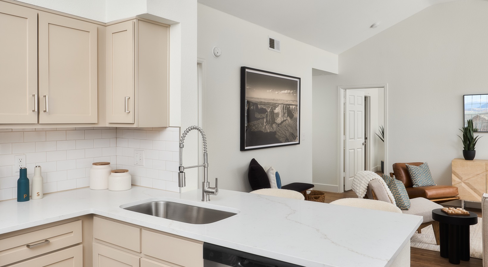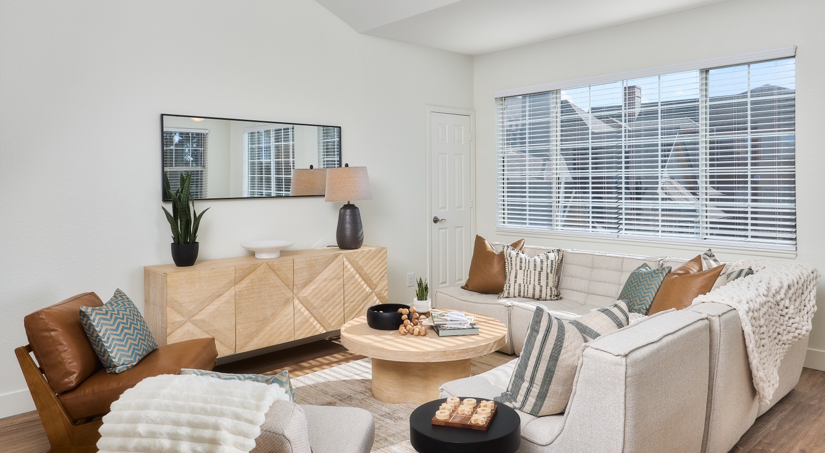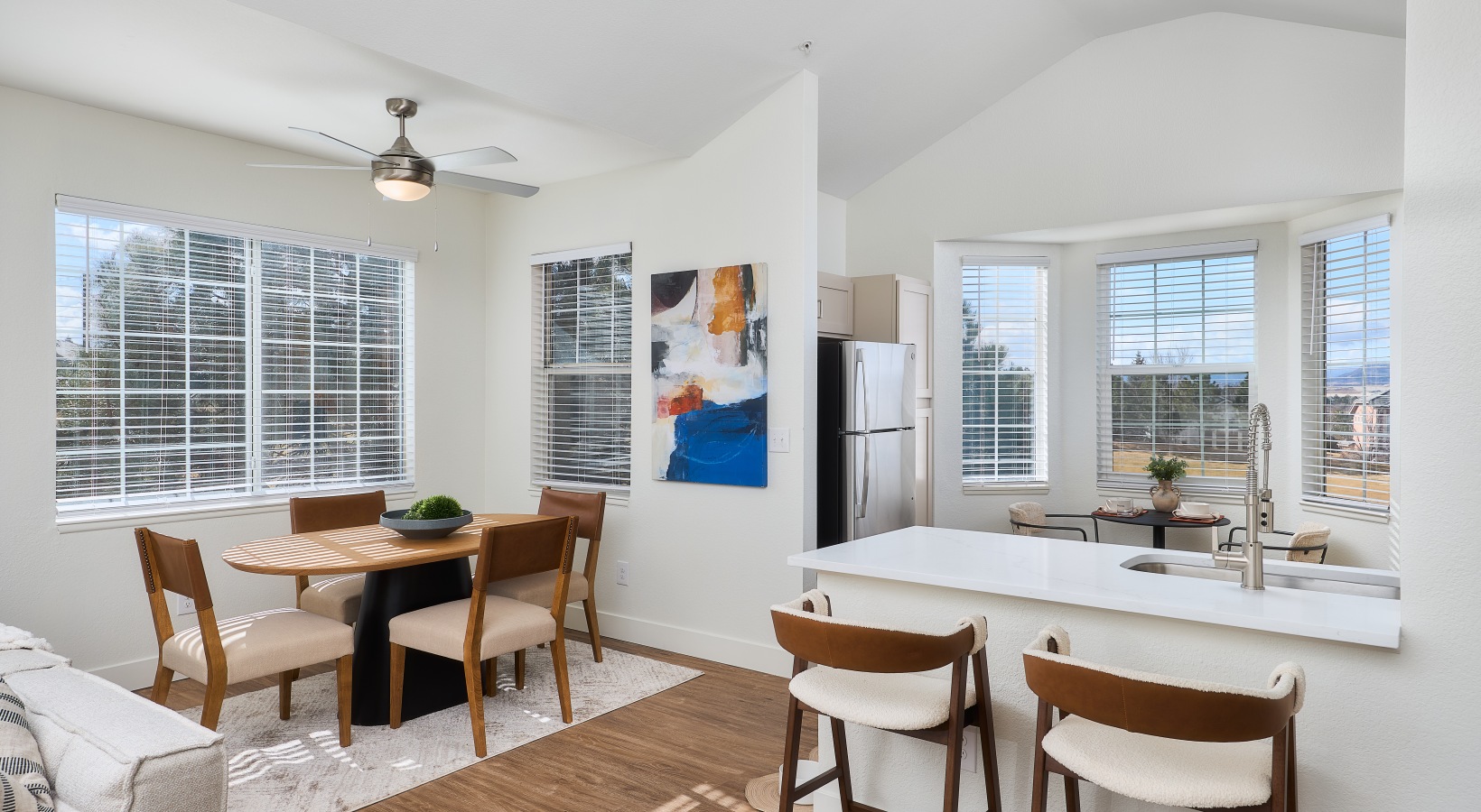 • Contemporary apartment interior with bright windows, wood-style flooring, and open kitchen design